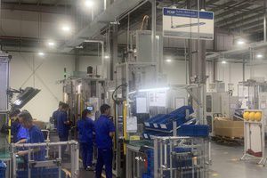 德国斯泰必鲁斯(浙江)有限公司工厂,汽车电动尾门撑杆组装线正在作业。(新华社记者于佳欣摄)